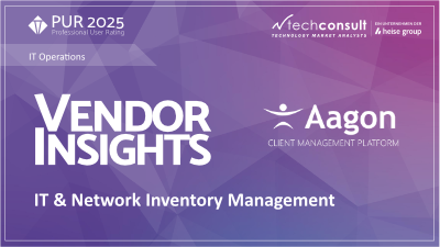 Aagon zählt im aktuellen Professional User Rating – IT Operations (PUR IT-Ops) erneut zu den führenden Anbietern im Bereich „IT & Network Inventory Management“. Die durchgängig positiven Bewertungen der Anwenderinnen und Anwender bestätigen sowohl die hohe Qualität der Lösung als auch die exzellente Leistung auf Unternehmensebene.