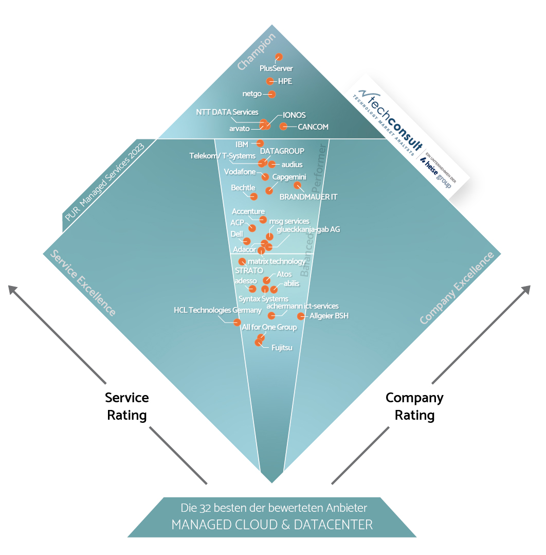 Anbieter, die sowohl eine exzellente Unternehmensbewertung als auch eine exzellente Lösungs- /Servicebewertung erreichen, werden schließlich zum „Champion“ prämiert.